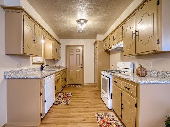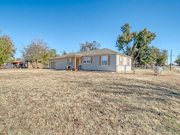 Fully updated home right in the heart of downtown Blanchard! Large Corner (on 4 city lots). Covered front porch & patio. New siding and shutters. 1,154 square feet. 1 of the garage has been converted, could be 4th bedroom or study/flex space. Updated HVAC system & roof. New vinyl & carpet flooring. Kitchen with new granite countertops, hardware, pantry, under mount stainless sink, & gas range. Updated fold out windows. Fresh paint throughout. Updated lighting & plumbing fixtures. New blinds. Alley access from backyard. Lawn has been treated for stickers & weeds. Large storm cellar in the back. Large fully fenced yard with mature trees (Playset stays). Additional sidewalk has been added. Electric water heater. Public water & Sewer. Gas heating (ONG). Blanchard Schools (less than a mile). McClain County