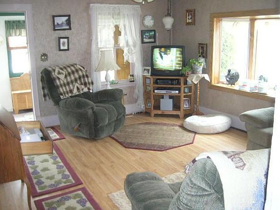 Grape bushes, raspberries, blackberries, perennials, fenced backyard. New electric service, 3-stall garage w/ heat, all new windows, wired for 220volt. New laminate floor in living room. Steel roof. 1/2 hour from GFAFB