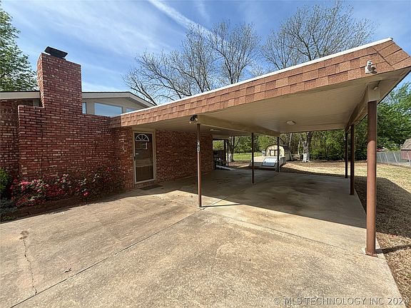 Check out this charming mid-century bungalow, centrally located with 3 bedrooms and 2 baths. This 1440 square foot home has a double carport, spacious covered back deck that overlooks the backyard with 2 mature pecan trees. In ground storm shelter is just steps away from the back door. With an updated roof, windows, HVAC and all appliances, (including washer and dryer), this home is move in ready. The combination living/dining room has vaulted ceilings with clerestory windows for natural light. Fireplace has gas jets and is wood burning. Master bedroom has private bath with a tiled shower.