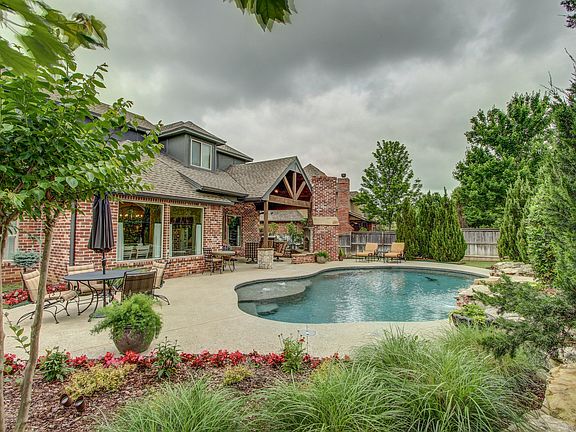 Jenks NW. Warm and Welcoming...ready for your family fun! Designated office, plus 2 beds down. 3 beds plus media/game plus small bonus room up. Back yard living includes cov'd patio w/Fireplace, grill, TV & saltwater pool for relaxing and entertaining. All media stays incl. projector, screen seating. Safe Rm. Updated appliances & custom window treatments. Fantastic family neighborhood w/pool and clubhouse. 10 min to downtown.