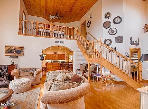 Beautiful large family home in desirable The Woods at Pinetop. 4 bedrooms (possible 5) 4.5 baths, 3 levels include separate guest quarters (or family play room), accessed by unique oak spiral staircase or private front entrance. Great room with vaulted ceilings with lots of windows with abundant light and gas fireplace. Large open kitchen with island, granite counters and breakfast bar. Large master bedroom with en-suite w/jetted tub, separate shower w/multiple shower heads and large walk-in closet. Loft, large laundry room, multiple decks, corner lot near Woodland Lake, 2 a/c's and so much more.