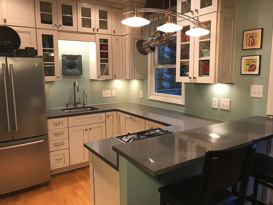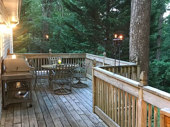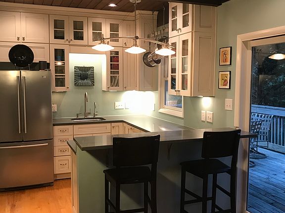 Updated Kitchen with top of the line cabinets, Blanco faucet, modern quartz countertops, gas stove, and stainless steel appliances. Breakfast bar in kitchen. Open floor plan and Mid-Century modern ceiling on the main level with exposed beams. Recessed lighting and refinished hardwood flooring throughout the main level. 3 bedrooms upstairs with Jack and Jill bathrooms. Walk out, finished basement with smaller kitchen and 2 additional bedrooms and bonus room for office or storage. 3 parking spaces. Super friendly and quiet residential neighborhood in the heart of Chapel Hill. Two story expansive decks with view of Bolin Creek. Walkable to greenway, parks, coffee shops, neighborhood pool, restaurants and independent bookstore. On busline and ~ 1 mile from UNC campus. Large fenced in back yard.