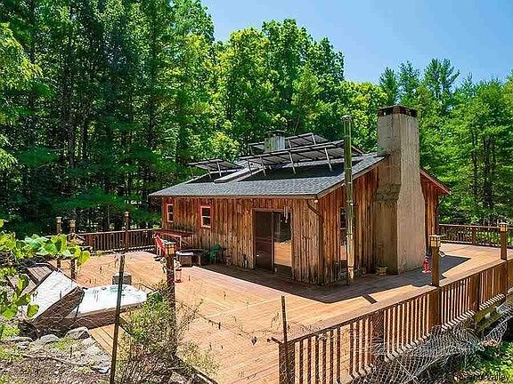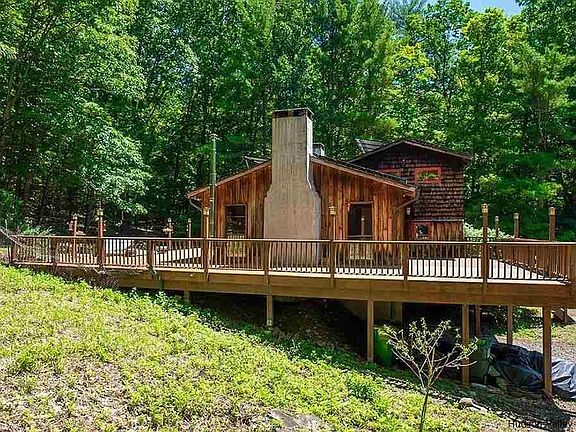 Wittenberg Road is an iconic "Catskills" locale; a beautiful winding country road that connects the Village of Woodstock to Mount Tremper, to Phoenicia; houses of every style and era tucked back from the road and peeking through the trees, hills, and valleys. Wilson state park with local camping and nature walking trails accessible across the street. Countless Catskills house-hunters ask for a house on Wittenberg Road - they're rarely available. The house is located on two connected wooded lots totaling 4.69-acres on beautiful Wittenberg Road. This unique, Catskill-style home is comprised of three floors, which include a primary bedroom with attached bathroom on the top floor, space for a den and second bedroom (if desired) in a "sub-level" off of the living room, as well as a three-room basement with wood-burning stove that is filled with possibilities. The custom-built home features an expansive, wrap-around deck with amazing hot tub; exposed timber ceilings; handmade wood cabinetry; and solar panels to maximize efficiency.