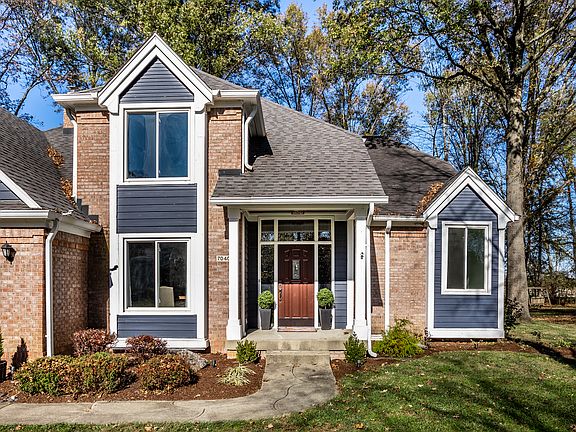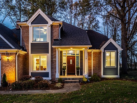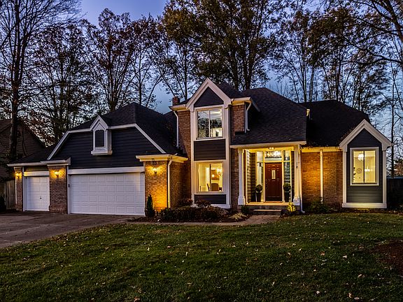 Beautiful home in the welcoming New Palestine neighborhood of Schildmeier Woods with mature trees and a strong sense of community. This home features a main level primary suite with a fireplace, renovated bathroom including a soaking tub, tiled walk-in shower, and designer closet. Newer flooring & vaulted ceilings in the family room with floor to ceiling windows overlooking the backyard. Updated kitchen with an enlarged pantry, granite counters, new backsplash and fresh paint. Take dinner to the sunroom or beyond to the large deck! The spacious layout includes 3 bedrooms & 2nd full bath upstairs. Appealing entertainment space inside and out! Enjoy the large backyard with an expansive deck, gardens, and a fully fenced yard. Recent updates include the renovated 1/2 bath, new windows, roof & gutters, HVAC, exterior paint, and whole-home air purification system. Main level laundry room & attached 3-car garage with an air compressor!
