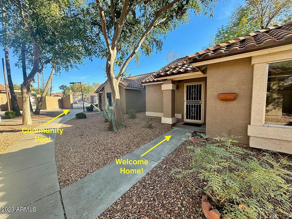 WOW! PRIME LOCATION in Community. 2 Bed/2 Bath, Single Level, North Facing, STAND ALONE Home, located STEPS from Community Pool, Spa, Mailboxes! Roof replaced 2023! Tile Wood, Carpet, Interior Paint, Refrigerator, Disposal, Oven/Range,Toilets, Fans REPLACED 2023! Kitchen features white cabinets, GRANITE counters, PANTRY! Primary Bed has separate sliding door leading to large grass area w/Mature trees! Primary bath has double sinks, Tub/Shower AND Walk-in Closet! Enjoy morning coffee on Private Patio w/small block wall and iron fence/gate! Conveniently located close to grocery, schools, shopping and 101. HOA covers Roof, Unit Exterior, Trash, Common Areas, Pool and Spa. Come check out Olive Square Community!