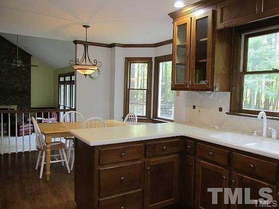 TONS OF POTENTIAL! Prime secluded location & acreage near downtown Apex/540. New carpets & refinished wood floors. 2.5 acres. Oversized Rec room with wet bar. Huge living room with masonry fireplace & dynamic views of large backyard, deck, and wooded landscape. Separate dining room, breakfast nook & open kitchen. Heated 2-car garage has walk-up to heated finish-able space above it. Close to shopping & restaurants. Available septic permit shows approval for 3 bedrooms. 2.5 bathrooms.