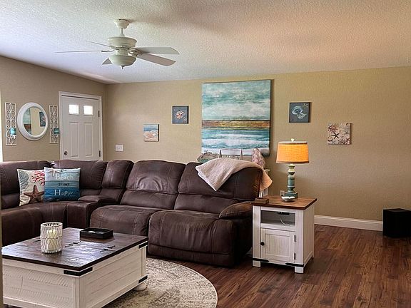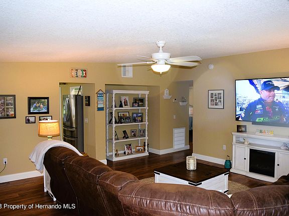 ATTRACTIVE PRICE REDUCTION/IMPECCABLE MODEL LIKE HOME/BRAND NEW TRANE HEAT PUMP SYSTEM with so many opportunities.....ALL ABOUT LOCATION adds more desirability to this 2/2.5/oversized 2 Car Garage plus 3 OR 4 Car Carport room...sitting on .77ac and lots of covered areas outdoors for grillin' & chillin' in the hot tub while watching TV! Ceiling fans and oscillating fans keep you cool outdoors. The home was purchased in 2014 and was TOTALLY GUTTED.....walls, ceilings, insulation, windows, doors, duct work, 5'' baseboards, electrical wiring, plumbing, lighting, fans, flooring, appliances, cabinets, counters, bath fixtures, shower and shower doors, mirrors, electric panel boxes in main and detach garage ALL from year 2014 or newer! PLUS main drain field DONE 2019, well 2019, PTO roof 2014, BRAND NEW TRANE HVAC SYSTEM INSTALLED 8.14.2023 with a transferable limited warranty other features and details too much to list! Carport area is approx. 770', attached garage is approx 294'. THE DETACHED GARAGE parking is approx 384' PLUS HAS A UTILITY AREA AND FULL BATH THAT IS approx 128' and COULD EASILY BE CONVERTED INTO LIVABLE AREA FOR WHATEVER YOUR PERSONAL NEEDS ARE.....A TEEN, GUESTS, INLAWS, CAREGIVER, HOME OFFICE, HOME GYM, IT HAS A LOT OF FLEXIBILITY! The home is a great room home with a semi-vaulted ceiling that carries through into both bedrooms, beautiful wood-look laminate flooring and larger trim work is throughout main living areas including both bedrooms, Tile flooring is in the wet areas including kitchen, bathrooms and laundry. Kitchen has all Whirlpool appliances including SS French Door Fridge w/ separate vegetable pull out drawer about 4 yrs old....New flat top range in 2022 with warranty until 2025, dishwasher has been barely used, built in microwave, SS deep sink with detachable SS spraying goose neck sink fixture are all included! Newer white-wood-look cabinetry below with newer granite counter tops, above is open industrial-look shelving for plates etc. (if a buyer wants to match the lower cabinetry the upper cabinets can be purchased for about $750) There is a bonus refrigerator in the detached garage! Off of the kitchen is a laundry room with a 1/2 bath, (picture coming.) Off the other side of the kitchen is a step down into a dine or wine room, there is a pass through over kitchen sink for convenience to the dine or wine room! Main bath has a new large tile shower with heavy glass doors with rollers at the top to make cleaning along the bottom without a track much easier! Vanity is wood-look and granite top with tile flooring Master Bedroom has a walk in closet and another large oversized closet with barn doors, windows allowing light in, ceiling light/fan fixture, wood-look plank laminate flooring. Nice size guest room off of main bathroom with nice size mirrored closet doors, windows allowing light in, ceiling light/fan fixture, with wood-look plank laminate flooring The property has a partial sprinkler system installed. Very High and Dry in an ''X'' FEMA flood zone and less than 3 minutes to jump on the Suncoast Parkway for easy commuting. Can't beat the location for loads of shopping, eateries and medical access there are 2 hospitals within a 5 minute drive! You need to see this home to appreciate the comfort, coziness, cleanliness and what the property and land have to offer! FALL IN LOVE TODAY..COME SEE!