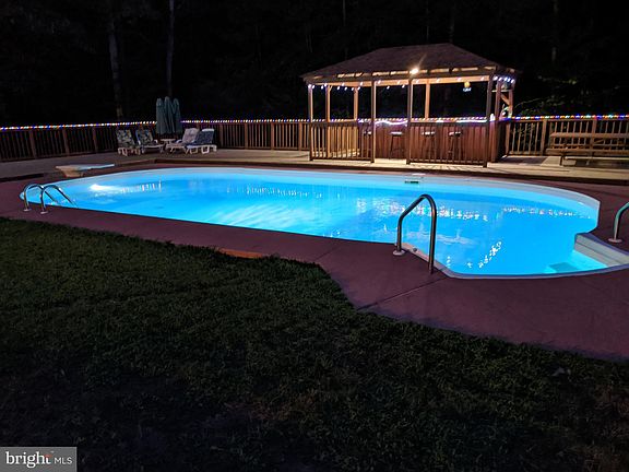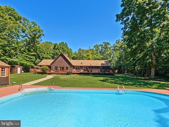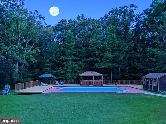 5 bedrooms home includes 2 master bedrooms with their own bathroom and walkin closet, and both master bedrooms have french doors leadind onto a very spacious deck, 4 bathrooms (the 2 master bathrooms are part of that number), large country kitchen with dining area, separate first floor laundry room, large living room with big brick fireplace and 15 foot cathedral ceiling, big loft looking down on living room with a connecting walk way to an in-law suite with separate bathrooms, situated above a 2 car garage. A beautiful inground pool with tiki bar and a huge surrounding deck, 3 out buildings, all set in 8+ acres of mostly wooded land that backs up to Doncaster Park so lots of wildlife visits the property. Full basement with working fireplace just waiting to become the perfect game room / man cave.