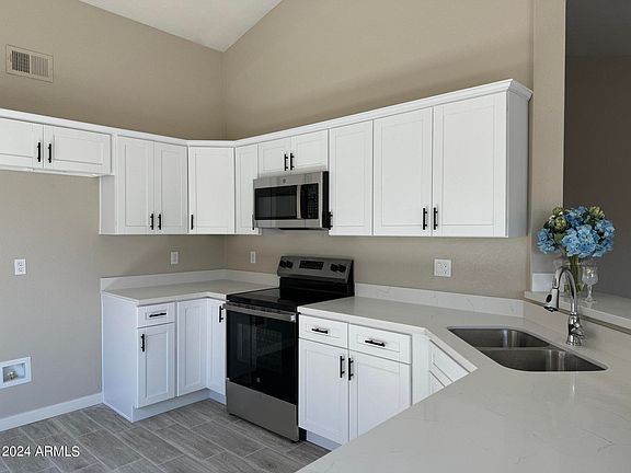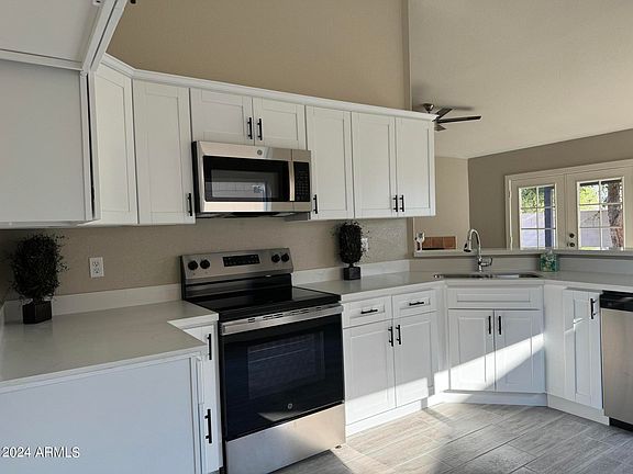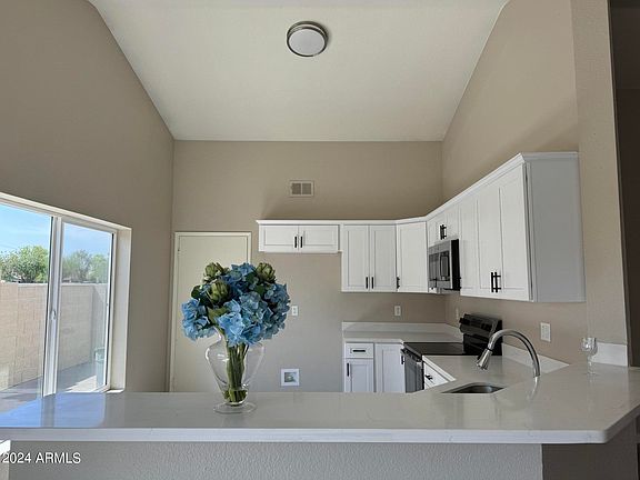 Must to see!! Beautiful completely remodeled in 2024. New roof, tile through the whole house, brand new garage door, brand new dual pane windows. New fixtures, Quartz counters, new cabinets, new bathtubs, painted interior and exterior. Great location and located across street from elementary school and near parks and shopping. Large great room, kitchen and 3 bedrooms. Easy access to loop 101 and close to football stadium, and some of the greatest shopping in Glendale.