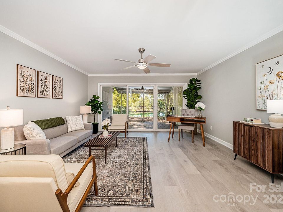 Welcome home to your beautifully updated condo with a townhome-like layout in highly sought-after Quail Hollow East at Quail Hollow Estates—known for its prime location, scenic landscapes, mature trees, and well-spaced buildings. This move-in ready home shines with fresh paint and new hardware, lighting and plumbing fixtures, LVP flooring, carpet, and stainless steel kitchen appliances. The spacious living and dining area opens to a private brick patio with a new awning and serene pond views and access—perfect for relaxing or entertaining. The kitchen offers granite countertops, a cozy breakfast nook, and pantry. There is ample storage throughout and the flexible two-bedroom layout allows for a home office or guest room. Both bedrooms include generous closet space, including a walk-in closet in the primary suite. Enjoy premium amenities including two pools, clubhouse, tennis and pickleball courts, and scenic ponds. Exceptional location near Sharon Rd. and Park Rd.—minutes to Quail Corners, SouthPark, Park Road Shopping Center, Carolina Place, Quail Hollow Club (home to prestigious golf tournaments!), Little Sugar Creek Greenway, parks, schools, and interstates. Includes two assigned spaces, one covered, plus guest parking.