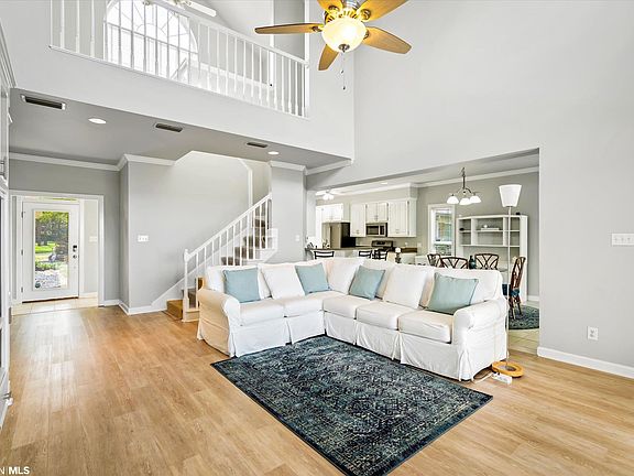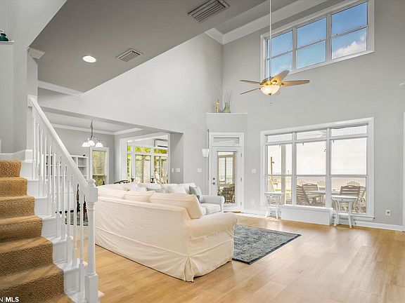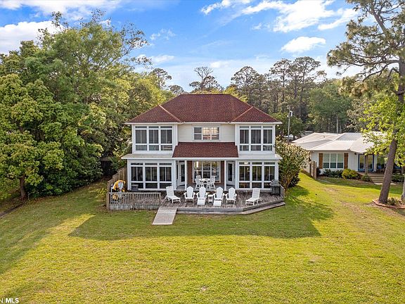 Bay Front Home 75’ frontage, 200’ newly rebuilt lighted pier, 2 covered decks, 2019 Fortified Roof per Seller, exquisite views – sunrises, sunsets, pelicans, osprey, geese, dolphins … hear the seagulls? The fish are jumping! Back deck affords grilling, friends, family and outdoor fun! Kayak, boat, fish or go crabbing right here! Listen to those waves lap against the shore! Fun is an indoor and outdoor activity here. 4 Sunrooms overlook the Bay – see the water from almost any room. Living Area is a 2-story expanse of light and space –Bay to Sky View – large built-in ready for books and memorabilia. This 4-BR, 3.5 BA home offers many more features. Open Plan, soaring 2-story ceiling main Liv Area, Granite and new Stainless GE Kitchen appliances (Refrigerator, Gas Stove and Microwave), Pantry and Laundry Room. Main Bedroom features 1 of the 4 Sunrooms. Luxurious tiled and glass block accent en suite for the Main Bedroom. 2nd bedroom could be used as a Mother-in-Law Suite, studio, office .. several possibilities come to mind. A separate full shower bath for 2nd bedroom - check out glass countertop in the 2nd bath. Upstairs, the breezeway, overlooking Living Area, offers a grand view of Mobile Bay and pier. On each side - a bedroom and a Sunroom! All provide a full view of the Bay! They share a full bath. Half bath is on main level. 2-car garage. Upgrades? 4 sunrooms, New Tile/Vinyl planking in sunroom and outside covered patio, Full house generator (22 KW Generac – activates automatically), solar lighting on waterside deck, pier and covered pier deck, 9 new ceiling fans, new privacy fence, electric hurricane shutters along bay side, Navien 210 Tankless Hot Water Heater… more. There’s a list. Walk to Park with picnic table, swings and beach access; close proximity to Boat Ramps/Slips; Seafood Restaurants. Call your favorite Realtor today!