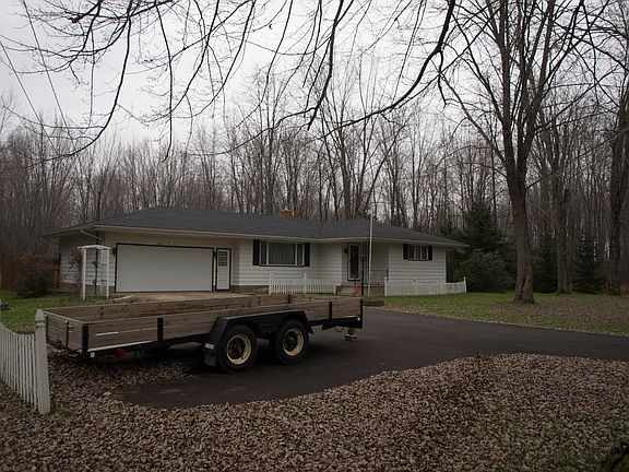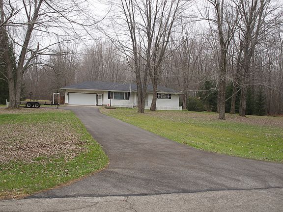 Beautiful mostly wooded 5.3 acres 164 x 1221. 3 bedrooms, 1 1/2 baths, livingroom, dining room, large basement, 12x14 shed/outbuilding. Recent updates: Furnace & AC 2002, Roof & Gutters 2010, Outbuilding Roof 2010, Garage Door 2010, Hot Water Tank 2013, Sub pump #1 2012, Sub pump #2 2013, basement waterproof 2006, glass block windows 2002, kitchen Kraftmade 2005, bathroom 2012, driveway 2013.