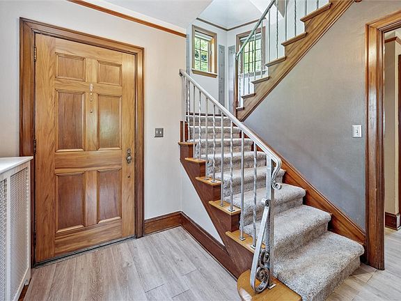 This gorgeous 1931 Colonial is a true classic. This majestic brick beauty has so many amenities! Private gate & hear the gentle splash of the water fountain on relaxing deck.Surrounded by bright landscaping &perennials that grace the three-tiered lot. Hall has original solid aluminum rails (hand-forged by Wendell August himself!).Original HW under LVP in Kitchen,hall, DR. !Inviting family room has newer carpet,WB fireplace, built-in shelving.DR has bright windows &enchanting garden window w/stained glass.Kitchen has side entry door to patio, LVP flooring, newer fridge, delightful attached dining booth.Added wine racks, laundry shoot and powder bath in front hall. Upstairs there are two nicely sized full baths w/tiled flooring and tubs. Master BR has added walk-in closet (poss nursery w/doorway to hall).2nd & 3rd BR's have newer carpet, ceiling fans.3rd fl has gameroom, 4th BR (or den).LL laundry and storage,2 car garage!Outside is paradise w/trees,fresh mulch,playset,private flat yard!