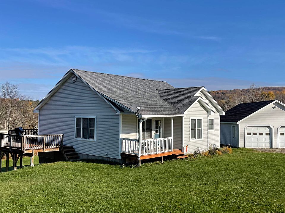 Comfortable,well constructed 3 bed, 2 bath home located in the Cabot countryside. Covered front porch entry into open concept living room and kitchen combination have plenty of natural light. Glass sliders from kitchen to large wraparound deck overlooks this country setting. Hallway to three bedrooms which includes primary with en-suite bath. Basement is partially finished with marbleized concrete flooring makes room for recreating with family and friends and includes a fireplace to sit quietly and gaze out towards sunsets in the evening. Property includes detached two car garage with epoxy floor. Home is within a half mile to village amenities. Cabot is located equa-distance of 21 miles to Montpelier or St. Johnsbury and one hour to Burlington. There are many trails for the outdoor enthusiast to enjoy hiking, cross country skiing,snowshoeing,VAST trail just up the road. Less than one hour to three major ski resorts. Land is to have survey completed November 2024.