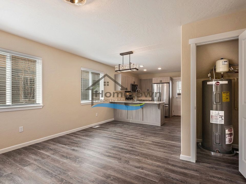 Beautiful Brand New Custom Craftsman Home in Coeur d'Alene with 2 Bedrooms and 1.5 Bathrooms! This stunning new home was built in 2021. At 972 square feet, this house features two bedrooms, and one and a half bathrooms. The home is located in a new subdivision in Coeur d'Alene. The front door of this home sits under a covered porch large enough for patio furniture. Upon immediate entry into the home, you walk into an open living-dining-and-kitchen floor plan. Picture windows allow natural light into the whole living and dining area. The entire main level of the home features luxury vinyl plank flooring. The kitchen features all new appliances including a stainless steel stove, a stainless steel built-in microwave, a double-door stainless steel refrigerator, and a stainless steel dishwasher. The kitchen countertops are granite and include a breakfast bar with room for three barstools. The kitchen cabinets are made of knotty alder with dark bronze fixtures. A laundry room with washer & dryer hookups, extra cupboard space, and a half bath are also located on the main floor. A back door leads to a fenced yard. The master bedroom, a guest bedroom, and a full bathroom are all located on the second floor. The second floor is carpeted with new luxury carpet. Each bedroom has a full sliding double-door closet. The home also features a single car garage, a sprinkler system, and air conditioning! The whole home is heated with a new and efficient forced air furnace. This home is HOA free! No smoking. Application Fee: $40.00 Security Deposit: $2,075.00 W/S/G Flat Rate Fee: $85.00/month No Pets No Pets. No Smoking
