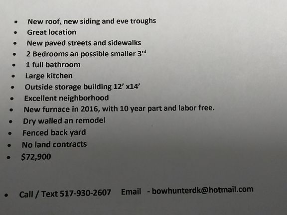 Great home for the price . Excellent location. New shingled roof, new vinyl siding an gutters in 2013. New furnace in 2016. A 10' x 14' utility shed , has electricity and a storage loft. All new paved streets and sidewalks. Very quick ,easy access to the 127 express way . Very peaceful part of city , in a great neighborhood. More home information in one of pictures. First floor laundry.Please let me know if you want bathroom an bedroom pics, I had troubles downloading them to Zillow. Please call Dave , any time , for a personal showing or any questions, 517-930-2607... Thanks.