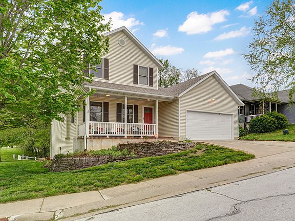Situated on a gorgeous corner lot in highly desirable Ozark, just up from the fabulous Finley Farms and a short walk to Finley River, this beaut will wow you on every level! Overlooking the charming multi-tiered landscaping up front, enjoy quiet summer evenings on the covered front porch. At the entry, upscale finishes abound. Soaring ceilings, rich hardwoods and inviting color scheme surround the focal fireplace, with tiled surround and classic mantle. The kitchen, with brand new stainless gas range and microwave, features dual color scheme granite, and a huge island, perfect for hosting family holiday dinners and social gatherings. Large pantry boasts plenty of space, in addition to the moody dark cabinetry. Glassed door leads to the back deck, which overlooks a wet weather creek area. Oversize Master with roomy en suite bath and enormous closet on the main level ensures privacy. Just up the stairs, find two large bedrooms and a 2nd living area, as well as a full bath -- so convenient! Through a custom glass door on the main level, the walkout basement features an additional HUGE living space and kitchen: perfect for in-law quarters, or adult children still living at home! Gorgeous cabinetry gives way to a gun safe that STAYS with the property! It has been bolted down, and code will be given at closing. Additional bedroom and full bath round out the space, along with an unfinished storage area, great for hiding allllll the things. Private exit door leads to a hand-laid rock patio. Experience all the peace, privacy and luxury multi-level living has to offer!