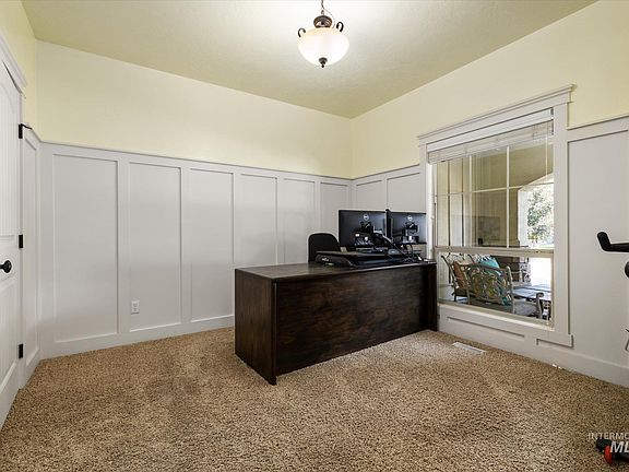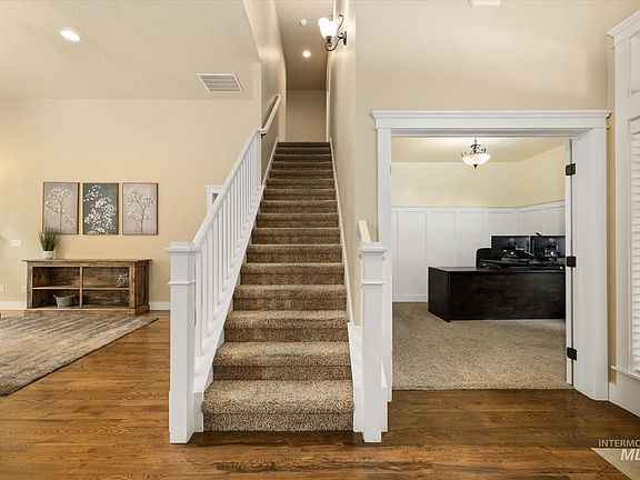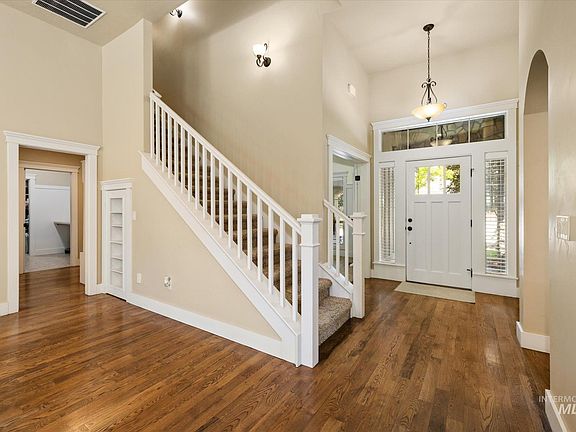 Exceptional former show home in Meridian’s sought-after Saguaro Canyon! Beautifully kept residence offers elegance,functionality,and thoughtful upgrades throughout.The desirable layout includes a main-level primary suite and a flexible room ideal as an office or extra bedroom,plus three bedrooms and a large bonus/media room upstairs. Features include true hardwood floors,custom knotty alder cabinetry, and sophisticated finishes. The open-concept kitchen flows into expansive, light-filled living areas.A deep 3-car garage with pass-through bay offers space for a trailer,workshop, or parking.Additional storage includes a walk-in pantry, utility room off the laundry, and a bonus area behind the media room.Saguaro Canyon features mature landscaping, tree-lined streets,and amenities like a pool,pond,walking paths,and parks.Located in north Meridian near shopping,dining,and schools.From its thoughtful layout and distinctive design to natural light and smart storage,this home blends sophistication w-everyday function