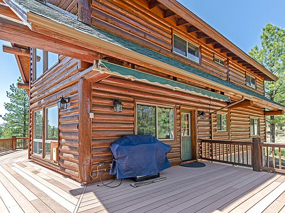 SELLER FINANCING AVAILABLE! Are you ready to own a log cabin beauty? Step into this enchanting full log cabin nestled on 2 acres of majestic Ponderosa Pines, offering breathtaking long-range mountain views. Boasting 3 bedrooms, 2 1/2 baths, and a charming loft area, this home welcomes you with open arms. The spacious great room features custom stone fireplace, wood vaulted ceiling, and an airy open floor plan, perfect for entertaining. Enjoy culinary adventures in the well-appointed kitchen with all the amenities you desire. Retreat to the main floor master suite with a large bathroom, double sinks, and a separate shower area, while the guest bedrooms offer private balconies for serene moments. Admire the craftsmanship of the wood staircase leading to a finished walkout basement, providing additional living space and ample storage. Completing this idyllic retreat is a deep one-car garage, separate shed, and a low maintenance Trex deck offering unparalleled mountain vistas. Horses are welcome in this gated HOA community, allowing you to fulfill your dream of owning a mountain cabin. Your dream cabin awaits - schedule your appointment today!