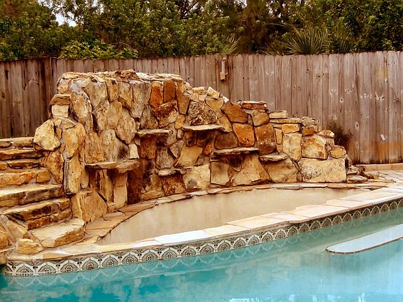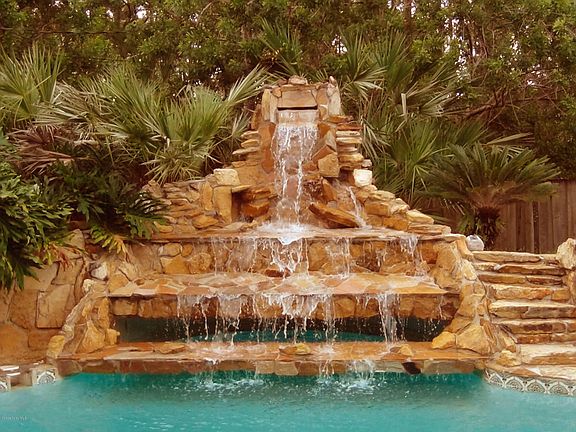 MOTIVATED SELLER! PRICED REDUCED! Tropical paradise awaits you with cascading waterfall, swim under lagoon, swim up bar, hot spa, Tiki bar, outdoor shower, gas grill, patio set and much more. Retro etched dbl doors open to stone fireplace, sunken living room, hardwood floors and built in bar. Many of fun parties and family gatherings await you in the large kitchen featuring a breakfast bar, newer stove, and dining area. Master suite boasts newly renovated fireplace, large jetted tub, new dbl sin ks, & separate shower. This almost half acre lot is lush with sprinkler system and paved winding drive. Basketball pad. All appliances included.