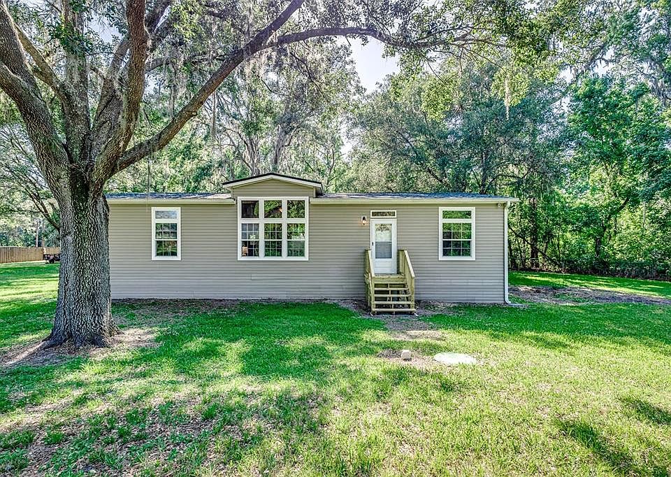 Do you love being in the country but still want to be close to everything? This is the home for you! This 2012 3 bedroom, 2 bath Skyline Siesta Key Model Manufactured Home comes with approximately 1 acre of fenced property with beautiful oak trees. As you walk into the back through the French Doors, you will love the tall ceilings and openness of how the kitchen, dining room and great room connect. The kitchen boast of beautiful dark cabinets with a great contrast of light colored vinyl, a center island and a pantry cabinet. Sit down for supper at the dining room table or head into the great room, with beautiful tray ceilings and crown molding, to take off your shoes and relax before supper. The Master Suite has double sinks, a garden tub with a separate shower with a very large walk-in closet. Love to keep the dirt outside? Enter through the laundry room which has a built-in sink for you to clean up as you come in and cabinets for lots of storage. Love the Outdoors? Take a Walk out to your Pavilion with a 6 person 8X8 Heated Hot Tub installed in 2016 situated on a large concrete slab. Here you can relax or cook out on the grill and entertain family and friends. Plenty of fenced in room for the kids and animals to enjoy the outdoors safely. Also, there are 2 sheds plus a covered dog kennel. Looking for room for your RV and Toys? Look no further. Hook up to the 50 amp service already installed or a separate electric pole for your convenience. Updates include: AC in 2016(but had recent top to bottom maintenance performed May 2023); 2021-new roof, 2023-new decks/porches at each entrance, new vinyl flooring in kitchen, laundry room and bathrooms. Flood Zone is X where the house is and A in the back near the creek which is behind the fence. No Flood insurance required per the seller. Buyer to verify all information Call soon before it's gone!
