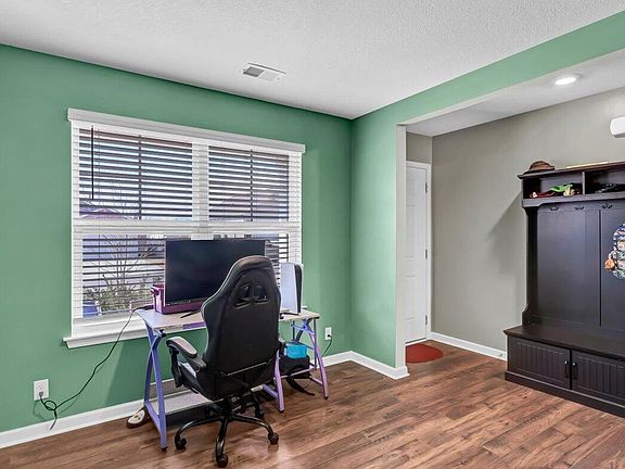 Step inside to find a flexible main-level floor plan featuring an office or formal living area, a half bath, and a storage closet under the stairs. The open-concept living room connects seamlessly to the eat-in kitchen, where granite countertops, an island, a pantry, and plenty of cabinet space create an inviting and functional space. A utility closet and an attached two-car garage add to the home's practicality. Upstairs, the spacious primary suite features a walk-in closet, a double vanity, and a walk-in glass shower. Three additional bedrooms, a full bath with a double vanity, a laundry room, a linen closet, and an extra storage closet offer plenty of room for everyday living. Laminate flooring runs throughout the main level, while carpet adds warmth to the upper floor, and vinyl flooring enhances the bathrooms.