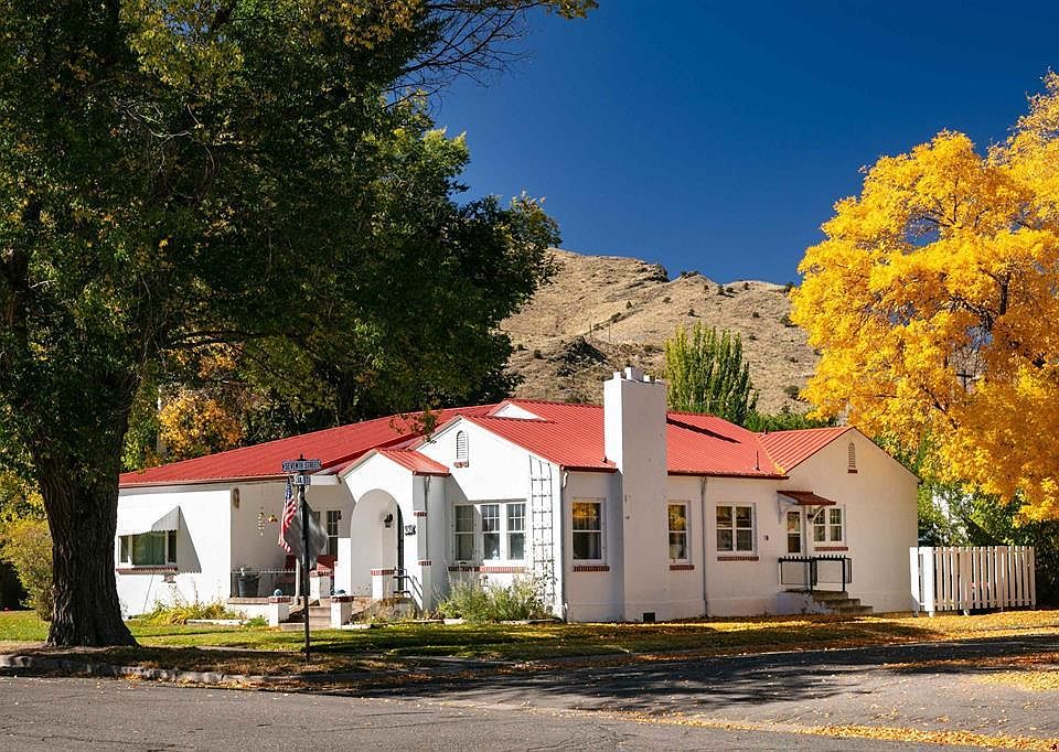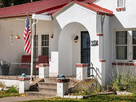 "SOUTHWEST STYLE HOME ON TWO CORNER LOTS WITH A DETACHED GARAGE/ORIGINAL ASSAY BARN IN DEL NORTE, COLORADO". This 2,260 sq. ft. stuccoed home has lovely mature landscaping with a sprinkler system, a detached garage with a workshop area and large upper level storage and/or creative work space. The home is one level, with the original ornate fireplace in the dining room area, a spacious primary bedroom with an office/sitting area entrance, a walk-in closet and a 3/4 bathroom. Under the living and dining room carpet is the original wood flooring. A charming custom era archway separates the living area and the family room. At the north side entrance is a laundry area with cabinetry. This 1936 era home has additional features such as a metal roof, newer HWH, and the hot water baseboard furnace was installed in 2018. A short distance from the property is an selection of of eateries, amenities, the County museum, a hiking and biking trail system, the Rio Grande river and parks.