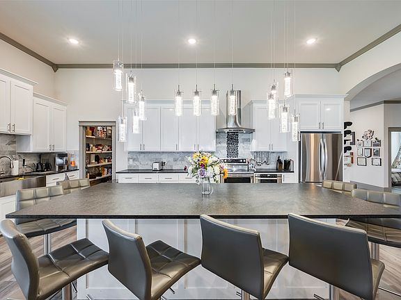 The chef-inspired kitchen boasts a large island with seating for gatherings, a walk-in pantry, and abundant storage, while the oversized laundry room adds even more functionality.