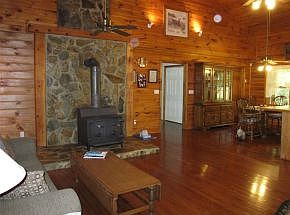Gorgeous ranch log home complete with private 8.62 acres, lots of woods,handicapped accessible, hardwood flooring, open floor plan, new roof, new water heater, all appliances - 12 x 20 outbuilding.What more could you want?? A urinal? Got that too! Fisher Wood Stove. Average utility bill $60/ month. Maintenance free living at its best. Sit on the 1000 sf porch and watch deer and turkey visit the back acerage.Also steep river frontage. Call soon, because this one won't last.