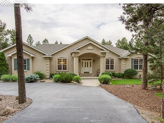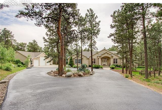 This beautiful home offers Black Forest life style at its finest! Set back among beautiful tall pines, this home has privacy and grandeur. Upon driving onto the property, you will notice the amazing custom landscape design, and a grand exterior elevation complete with stucco siding and columned front porch. Once inside the home, vaulted ceilings and beautiful hardwood floors greet you. The open concept floor plan on the main level features a dining room off the entrance, and a kitchen/great room/ eating nook all open to each other. The beautiful gourmet kitchen has newer countertops, a gas range in the large center island, and a big breakfast bar. Enjoy meals in the spacious dining nook while looking out at the tranquil forest setting through the numerous windows on all three walls. The great room is very large, features one of the home's three fireplaces, and has a walk-out out to an expansive back deck. The master retreat also has a fireplace, a huge walk-in closet, and a fantastic 5 piece master bath which has its own walk-out to the back deck. As a bonus, the walk-out basement of this home has been finished to offer a very spacious rec room with a third fireplace, along with a bonus room that can be used as a fitness or theater room, in addition to three spacious bedrooms. Walk-out through French doors to the lower level patio, which leads to a 2nd large wood deck on the ground level. A second garage was added and has 220V and a workshop, along with room for 3 more cars/recreational vehicles! This home is conveniently located with easy access to Hwy 105, but offers total privacy on 2.5 beautiful treed acres. Amazing landscaping featured in the front and back, and lots of places on the property to sit and enjoy the setting!