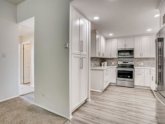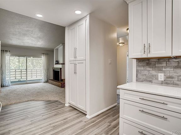 Beautifully remodeled top floor end unit with a fantastic location in Windsor Gardens! Bright and light home boasts amazing treetop views, overlooking the Highline Canal and trail, with views of Windsor Lake in the winter, and mountain views. This unit also has one of the very few wood-burning fireplaces in Windsor Gardens. South-west facing lanai is cool in the summer, sunny and bright in the winter. New compliant vinyl sliding door to lanai, and updated vinyl windows. Brand new contemporary kitchen - nothing was overlooked here! New 42 inch white cabinets, quartz counter-tops, gorgeous tile back-splash, all new matching stainless steel appliances, French door refrigerator with water and ice in the door. New COREtec flooring in the kitchen and adjacent eating area. Expanded pantry with deep pull out drawers. Bright overhead can lighting. Bathroom has also been newly updated with vanity, countertop and backsplash matching the kitchen decor, including a new sink, faucet, mirror, lighting, and toilet. Walk-in shower with built-in fold down bench and safety bars. New paint in kitchen, living room, and lanai. Carpeting was replaced two years ago. Master bedroom has huge closet with updated bi-fold doors, built in bookshelves, and newer in-wall remote controlled A/C unit. Matching A/C unit with remote in the living room. The second bedroom also has a large closet, with mirrored bypass doors. Newer 6 panel doors throughout the home complete the look. The monthly HOA fee includes property taxes! Building and grounds maintenance, heat, water, sewer, trash, and snow removal are also included. Additional amenities include indoor and outdoor pools, hot tub, and exercise facility. Single car garage located steps to the side entrance. One Year Home Warranty included! FHA and VA approved. Every party must wear a face mask. Showing times are limited to 30 minutes. Must wear shoe covers or remove shoes. Must wear gloves.