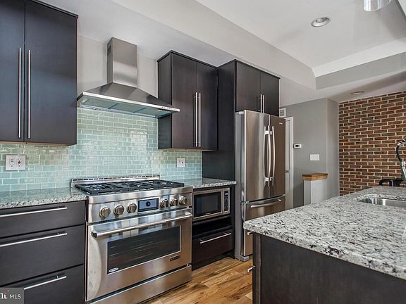 Newly constructed,Loft-style townhome in the heart of historic Fells Point,eligible for new construction tax credit.Contemporary industrial design- custom steel stairs/rails,unique random-width wd flrs, gourmet kit w/6 burner commercial range,granite counter tops & island,real wood garage & entry doors,exposed brick,study loft,large garage- (we fit 2 cars-small & midsize) &large rooftop deck.