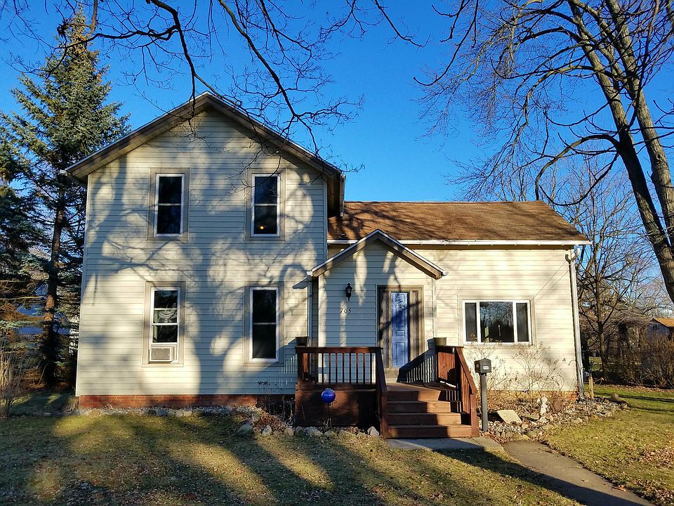Welcome to 705 Lansing, located in a perfect location for schools and the park in St. Johns. This charming home features original hardwood floors in large living room as soon as you walk through the front door. The house has upgraded windows in 2005, with recently updated trim throughout. The kitchen has beautiful oak cabinets with crown molding to the ceiling. The master bedroom is located on the first floor with two addition bedrooms upstairs. The large barn in the back has been used as a garage and workshop with stairs leading to a second floor. The garage has a wood stove for heat in the winter. The home has a large city lot with great backyard which includes kids play set.