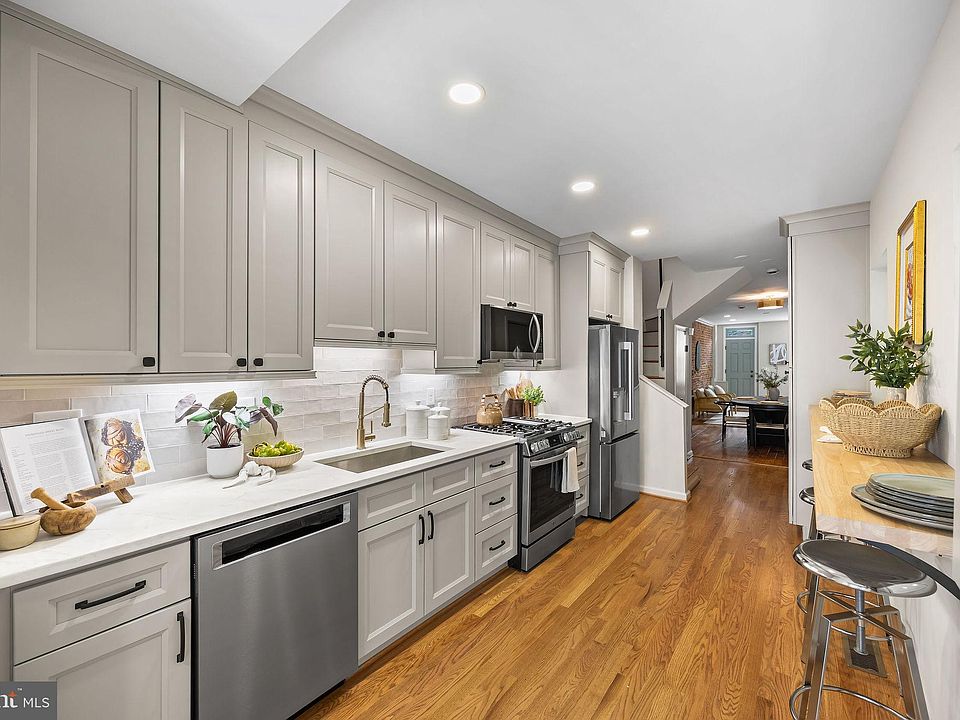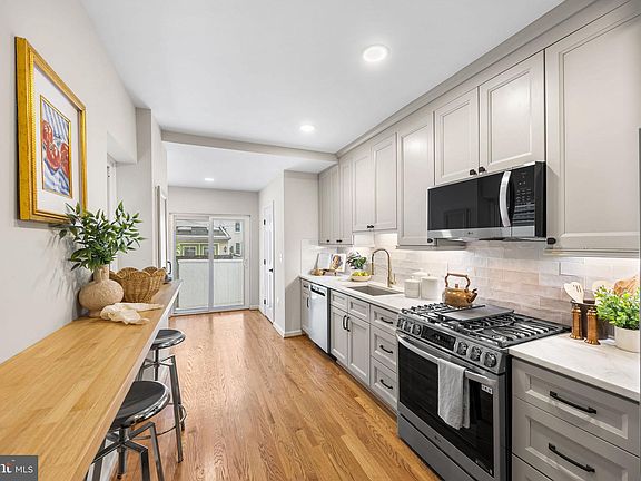 Welcome to this stunningly updated townhouse in the heart of Canton, perfectly blending historic charm with modern upgrades: *All renovations and upgrades were made to comply with CHAP historical standards as this property is pending a 10 year CHAP approval* From the moment you arrive, you will notice the curb appeal with a brand-new front door featuring an elegant transom window and new Fibrex windows that meet CHAP historical standards for authenticity and efficiency. Step inside to find beautifully refurbished original hardwood floors that bring warmth throughout the living and dining rooms, paired with striking exposed brick walls that add character and timeless appeal. Sunlight fills each room through large updated windows, creating a bright and inviting atmosphere. The kitchen is a true showstopper, completely renovated with sleek quartz countertops, under-cabinet lighting, and high-end stainless steel appliances. These include a French-door refrigerator with an in-door ice and water dispenser, a new gas range, and an over-the-range microwave. Whether you are preparing an everyday meal or hosting guests, this space delivers both style and functionality. Just beyond the kitchen you will find a convenient renovated powder room and a new sliding glass door with built-in blinds, that opens to a freshly updated private patio. This outdoor space is perfect for grilling, relaxing, or enjoying morning coffee. Upstairs, the spacious primary suite sits at the front of the home and features a French-door closet and a beautifully renovated en-suite bathroom with stylish finishes. The second bedroom is equally impressive with its own private en-suite bathroom, a newly built addition, which enhances the home’s layout and livability. Conveniently located, this home offers walkable access to Canton’s vibrant dining scene, local bars, boutique shopping, Patterson Park, and waterfront attractions. Commuting is simple with quick access to I-95 and I-695. With its prime location, thoughtful renovations, and preserved historic charm, this property offers the perfect balance of city living and modern comfort.