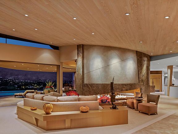 Phenomenal views from this elevated homesite, providing unobstructed south views of seven different golf holes on BIGHORN's Canyon course. An architectural work of art, this home sits on almost 2.5 acres, with lush landscaping and mountain views from every window. The infinity edge pool and spa are the backdrop for the views from the great room, dining room and kitchen. A second, separate lap pool is tucked away off the master retreat with easy access, also providing privacy from guests. Corner pocketing walls of glass open for seamless transition from the master retreat to the outdoor living areas. A custom fish tank serves as a headboard and a creative backdrop in the spa-inspired bathroom and workout area. There are two guest suites inside the main residence (one currently furnished as an office). There is also separate guest house tucked away, into the rocks flanked by sculptures and a 20ft tall waterfall. Outdoor living includes BBQ enter, fireplace with TV, putting green and views, views, views. Offered furnished.