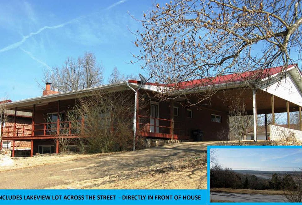 2 YEAR ROUND LAKE VIEW LOTS come with this 3BR, 3BA home. Nice large covered upper deck, open kitchen / living room area, 2 kitchens, 2 wood burning fireplaces, garage downstairs and large covered parking up, level back yard, nice neighborhood and just minutes from the marina and golf course. Make this your home or home-away-from home on Bull Shoals Lake.