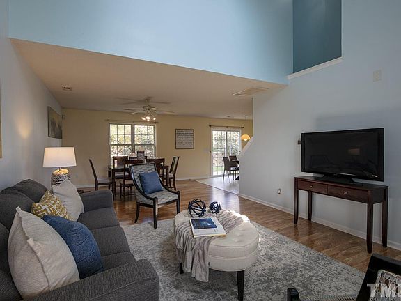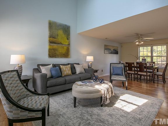 Bright and beautiful home centrally located near shopping centers, RDU airport and restaurants. Four sizable bedrooms, soaring ceiling in the living room, patio right off the kitchen perfect for grilling and gathering. 2-car garage with ample room for storage. Beautiful flowering plants at the back of the house. New floors in the living/ dining area. New paint in bedrooms. Newer heat pumps with a regular maintenance contract. A few steps to the community pool. What a great place to call home!