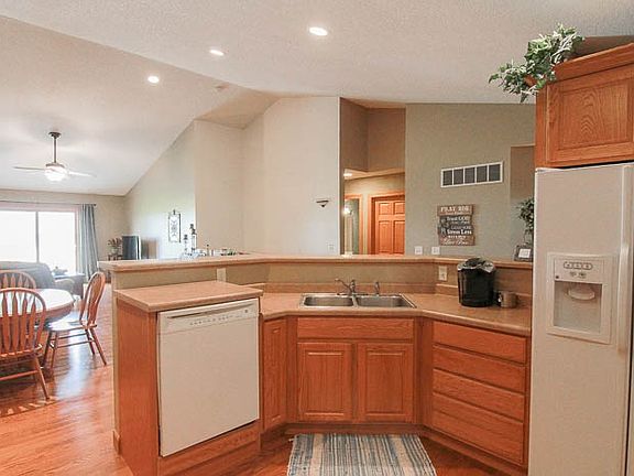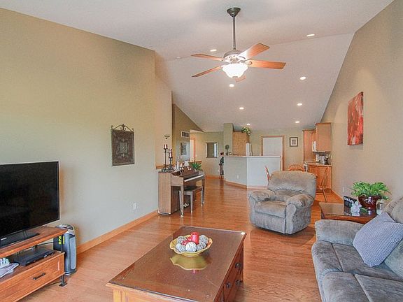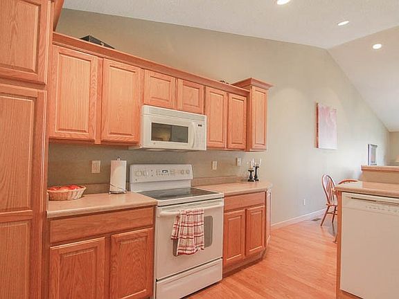 Like new zero lot; Kitchen includes raised panel oak cabinets, breakfast bar with stove, refrigerator, dishwasher, garbage disp, microwave and wood floors. Other appliances included washer/ dryer in main floor laundry. Open floor plan with vaulted ceilings, in living/dining room, and patio doors to rear deck. Solid core interior doors. Lower level has approx 1,000 sq. finished family room, bath, bedroom and storage with 9' ceilings. Two car attached garage is located directly off the kitchen.