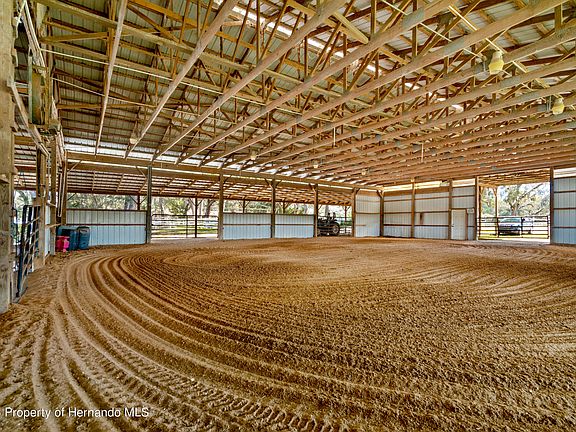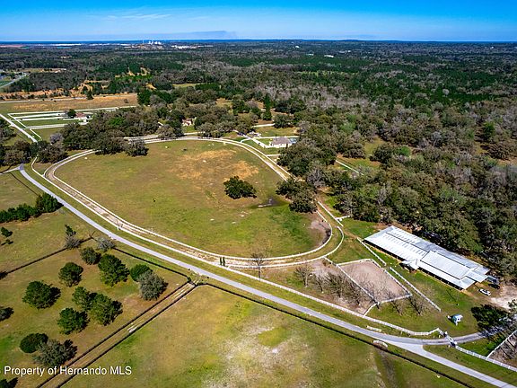 Prepare to be wowed by this stunning luxury equestrian facility in the heart of Brooksville, FL. This property features 3 parcels, totals 57+ acres, 3 residences, 20 stall center aisle barn with 40x60 indoor arena, outdoor arena, 1/2 mile race track, separate 8 stall barn, detached 3 car garage with storage, amazing greenhouse, miles of trails, and endless opportunities! The executive style main home is 2900+ living sq ft, designed with an in-law suite, 3bed/3bath, pool, bright open floor-plan with 12-15ft ceilings throughout, chefs kitchen, amazing entertaining space, peaceful and relaxing large back patio overlooking the oak trees, grazing cattle and seasonal pond, private drive/gated entrance, and whole house Guardian Elite Generac generator. The main guest house is a 3bed/2bath boasting over 2000 living sq ft and has tons of common/living space, solid block/brick construction, newer roof, and amazing views. The secondary guest home is a charming open floor-plan 1bed/1bath, roughly 1200 living st ft. Both homes would be perfect for income production, trainers homes, caretakers/barn, managers quarters. There is a 4 car carport attached and shared by the homes and a private gated entrance. The main barn is a 20 stall (2 foaling stalls that can be converted) center aisle barn with bathroom, large tack and feed rooms, office, barn bathroom, indoor arena with sprinkler system, gathering pavilion, wash bays, trailer parking area, hot walker, show/office shed by gated entrance, outdoor arena with sprinkler system, large fenced area with full jump course, covered overhangs, open concept for maximum airflow, 10 paddocks with auto watering systems, incredible views, and so much opportunity for income. The secondary barn is a center aisle, 8 stall barn, with bathroom, office/tack/feed room, wash rack, with a nearby RV hookup. The greenhouse is thriving and full of home grown veggies and fruits! The sellers love this greenhouse and have spent lots of time bringing it, and the amazingly rich compost pile back to life. The detached 3 car garage is amazing for storage, has a 30 amp RV hookup, and full generator. The two wells on the property feed each other, and the main home well pump was recently replaced. Make this your private dream estate or a valuable and profitable investment.