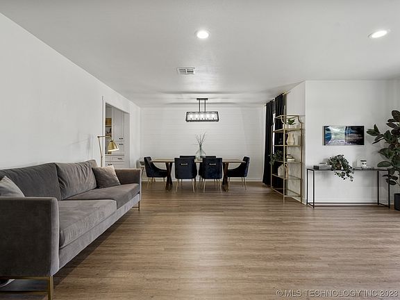 Stunning Full Brick One Level Transitional Style Remodel! Spacious formal living & dining. Great Room with wood burning fireplace opens to kitchen. Beautiful Quartz kitchen with undermount sink, island, stainless appliances, nook & pantry. Master suite has 2 closets, sleek oversized shower, shiplap & bowl sink. Hall bath with shiplap, white subway tile tub/shower. Additional family room is great for a playroom or game room. Nice laundry room with ample storage. Newer cabinetry, windows, blinds, sinks, doors, hardware, lighting, plumbing fixtures, roof, flooring & paint throughout. Large fully fenced backyard & full guttering. 3 Bed, 2 Bath, 2 Car. Neighborhood sidewalks, pool & tennis courts. Conveniently located with easy access to 169 & I-44. Close to shopping, dining & medical offices.