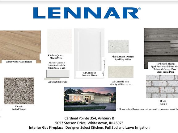 The ranch collection at Cardinal Pointe features LENNAR's Everything's Included package of extras & upgrades. Nestled within the lush greenery of the Golf Club of Indiana, Cardinal Pointe residents enjoy pool, playground & walking trail. Social Golf club membership included. Enjoy single level living with this amazing open concept ranch home. Then enter into the large great room with abundant windows which opens to the central kitchen island with breakfast bar seating. The kitchen features 42" high upper cabinetry and ample storage. Be greeted by the family foyer entry from garage with locker style built-ins for organizational ease. One of the highlights of this plan is the integrated covered rear porch, great for relaxing day or night. Finally, retreat away to the spacious owner's suite with dual vanity sink, fiberglass shower with glass door, and private water closet. A 3 car garage adds extra storage. The Ashbury is a must see. *Photos/Tour of model may show features not selected in home.