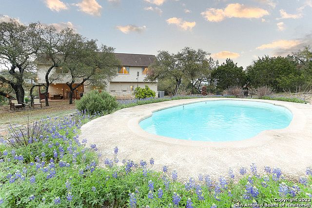 Spring Branch Splendor! You'll enjoy picturesque views from this spacious home tucked away from the road for the ultimate private life, but just minutes away from restaurants and shopping for convenient living. You'll love this sun-drenched spacious four-bedroom home. A beautiful stone fireplace anchors the open-concept living, dining, and kitchen area. Upstairs the bedrooms showcase the view of the backyard pool crowned by the spring splendor of bluebonnets. Wildflowers adorn both the front and back yards. The substantial-sized bonus room upstairs can be used for whatever you desire. No matter the season, this backyard is ready to entertain; you will have endless hours of memory-making fun by the pool, fire pit or grilling under the covered patio. Currently is an active short-term rental.