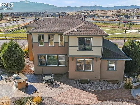 Absolutely stunning former John Laing model home with too many upgrades to list! This home is minutes away from shopping, schools and parks. You will love the large custom patio with firepit and built in BBQ grill. The stainless steel appliances, granite counter tops and balcony with amazing views of Pikes Peak are just a few of the amazing features this home has to offer. The finished basement with wet bar is perfect for entertaining. The attached oversized two car garage and upstairs laundry room with utility sink and cabinets are just a few of the added bonuses this home has to offer. Don't miss out on this incredible home! This lot is located close to the Marksheffel & Vista Cerro intersection and is only a couple of blocks away from the Ranch House. This neighborhood features include an award winning school-Banning Lewis Ranch Academy, over 75 acres of parks and trails, two pools, exercise gym, pickleball courts, tennis courts and recreation center.