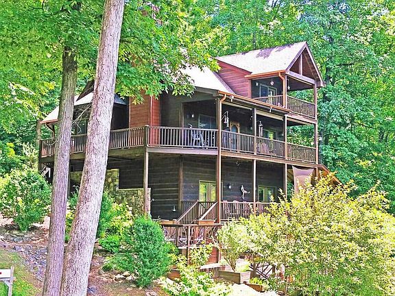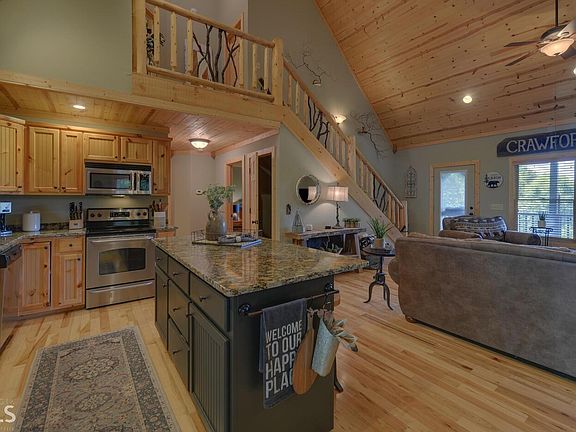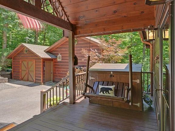 Great Cabin nestled in the North Georgia Mountains. Located in well maintained community. Features beautiful stacked rock wood burning fireplace, soaring cathedral ceilings and outstanding wood accents. Kitchen has center island, breakfast bar and stainless appliance. The upper master suite has a cozy private balcony that offers stunning views and a lovely master bath. Terraced back yard, fire pit, fruit trees and a recently added custom hot tub built into lower covered deck. As an added bonus, his & her workshop/art studio. All the wood details and bright open floor concept make this home a perfect mountain retreat or full time home.