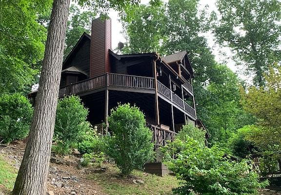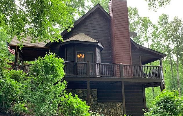 Great Cabin nestled in the North Georgia Mountains. Located in well maintained community. Features beautiful stacked rock wood burning fireplace, soaring cathedral ceilings and outstanding wood accents. Kitchen has center island, breakfast bar and stainless appliances. The upper master suite has a cozy private balcony that offers stunning views and lovely master bath. Terraced back yard, burn pit, fruit trees and a recently added custom hot tub built into lower covered deck. As an added bonus, his & her workshop/art studio. All the wood details and bright open floor concept make this home a perfect mountain retreat or full time home.