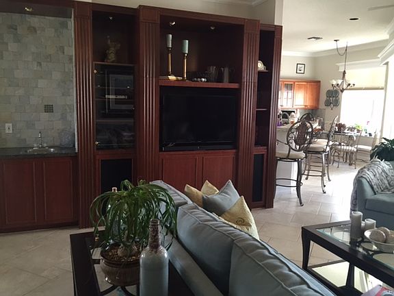 This home sweet home sits on an oversized lot with a huge yard with a fabulous premium lake view. Spacious and immaculate, this masterpiece of a home has so much to offer. The eat in kitchen has granite counters and a tiled breakfast bar. The kitchen offers extra cabinetry with a wine rack. There is a custom builtin in the family room with a wet bar. The stereo and tv are included with the home along with built in speakers. The huge master bedroom has french doors leading out to the patio and the 2nd bathroom is a cabana bath. The screened in patio is perfect for relaxing in and the owners are including the outdoor tv in the sale. The whole home has tile throughout. Move in ready!All this and there are even accordion hurricane shutters!