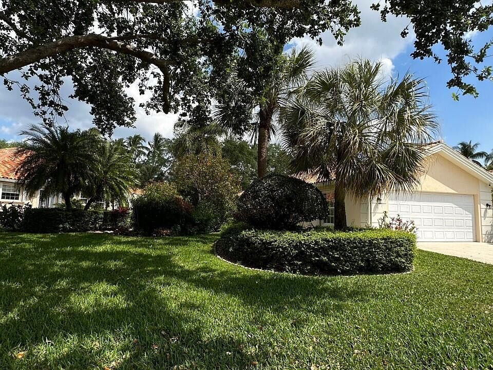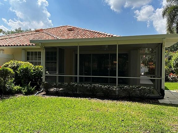 Exceptional property! This expanded Capri model is situated on a large pie-shaped lot overlooking grassy views from every window! Sit on the covered patio looking out on an expansive view of trees and garden. Freshly painted. White tiled flooring in the main areas, laminate in the bedrooms. The Great Room boasts a floor to ceiling built in wall unit with ample storage. The primary bedroom has a large walk in closet and an ''en suite'' bathroom with double sinks and walk in shower. The guest suite is situated on the opposite end of the home and features a generous walk in closet and private bathroom with bath/shower combo. The kitchen has generous cabinets and opens to the Great Room and dining area, perfect for entertaining. The laundry room has storage, utility sink, a/c updated. Central vacuum system, central alarm, shelving in the garage. Accordion shutters on all windows. Located by the beautiful walking trail that leads you over bridges to the RiverWalk Town Center and amenities.