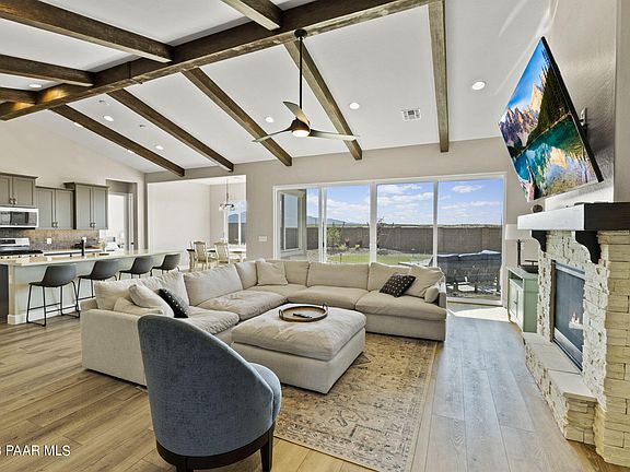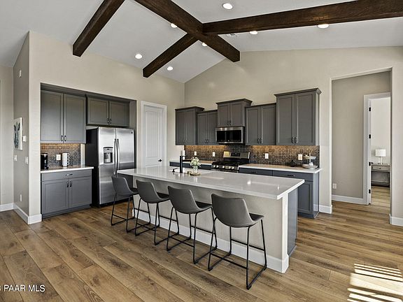 - Beamed Ceilings, Ceiling Fan(s), Solid Surface Counters, Eat-in Kitchen, Formal Dining, Granite Counters, Kitchen Island, Live on One Level, Raised Ceilings 9+ft