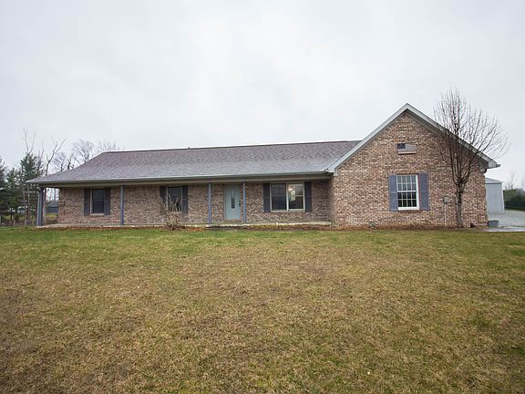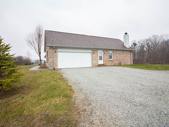 Welcome home to this 10 acre oasis in New Palestine with award-winning Southern Hancock schools. This serene setting has endless possibilities- woods with over an acre of trails, a 40X45 pole barn for work or hobbies, a tillable field, and front and back concrete patios to take in the relaxing view and frequent deer visitors. The all-brick ranch has a large kitchen open to a living room with vaulted ceilings and an heirloom mantle. Plenty of room with 3 bedrooms, an office/bonus room and a large dry unfinished basement with 9' ceilings and complete with daylight windows. See features sheet for the home's many updates. Absolute perfection for outdoor entertaining or relaxing, come see this property today!