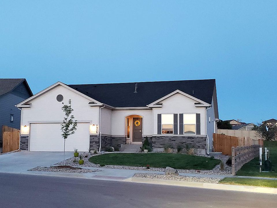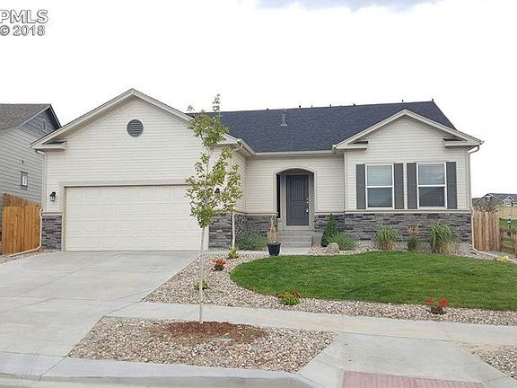 Beautiful move in ready ranch home in like new condition, only 18 months old. Fully landscaped front and rear yards with automatic sprinklers and drip system. A Classic Homes Rosewood - open floor plan with lots of natural light in a prime community with a very low monthly HOA. Oversized kitchen with quartz counter tops, large angled island, custom work back-splash and laminate realistic wood flooring. The Great Rm. is surround sound pre-wired as is the lighted over-sized 10'x25' covered concrete patio and....see supp. finished basement. The Master Bedroom has a large walk-in closet and adjacent dual sink master bathroom with dual head 6' shower. A second bedroom and a full bathroom completes the main level. The basement has two more large finished bedrooms that are cable ready. A full-size bathroom, large rec room with wet bar plumbing and over-sized storage room complete the like-new basement level. Outside you have a fully fenced back yard with no neighbors behind the home and a convenient walking trail sidewalk directly to the south. Fully insulated dry-walled garage with hot & cold water for car or dog washing & a double pane extra tall wall-built-in dog door with locking mechanism, are exciting extras. House faces West so you don't miss those beautiful Pikes Peak sun sets every afternoon, hurry up, this like new Classic home, will not last.
